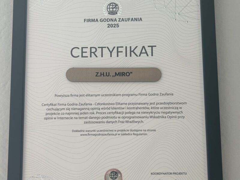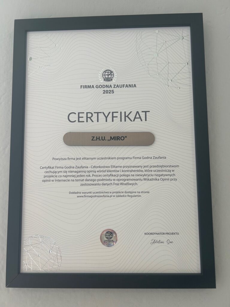 Zakład Handlowo-Usługowy ZHU. MIRO to rodzinna firma działająca od ponad 30 lat w regionie cieszyńskim. Właściciel Mirosław Kabiesz osobiście nadzoruje każde zlecenie, gwarantując najwyższą jakość wykonania i terminowość.